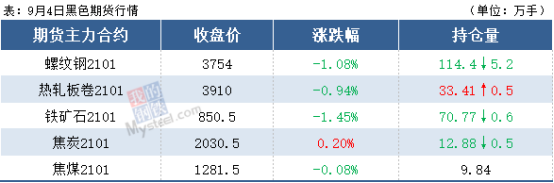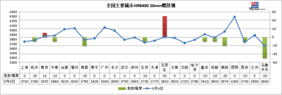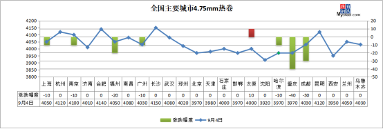 熱軋板卷:9月4日,全國24個主要城市4.75mm熱軋板卷均價4033元/噸,較上個交易日下跌5元/噸。今日黑色商品期貨市場低位震蕩,早盤現(xiàn)貨市場報價暫穩(wěn),受昨日夜盤跳水影響商家心態(tài)稍有走弱,盤中成交不佳,價格小幅下跌,午后市場情緒稍有穩(wěn)定,成交開始有所好轉(zhuǎn)。整周來看,供應(yīng)方面:產(chǎn)量繼續(xù)維持高位,鋼廠端受原料成本以及利潤支撐,主動減產(chǎn)意向不強;庫存方面:社會庫存開始累庫,北材南下華東資源量加大,華東地區(qū)部分碼頭開始出現(xiàn)排隊集港現(xiàn)象,短期市場壓力華東大于華南大于華北。預(yù)計下周熱軋板卷或?qū)⒕S持弱勢震蕩運行。