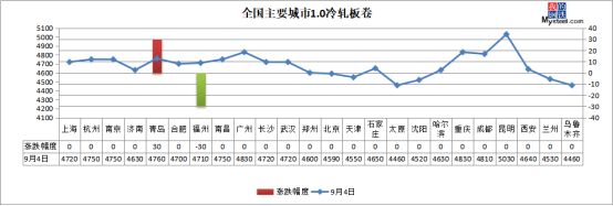冷軋板卷:9月4日,全國24個主要城市1.0mm冷卷均價4681元/噸,較上個交易日持平。基本面看,冷軋下游需求上升是拉動最近價格上漲的最強因素,下游制造業(yè)訂單增加,原材料消化明顯增加,帶動鋼廠直發(fā)終端訂單轉(zhuǎn)好,市場投放相應(yīng)減少,對價格有一定的支撐。綜合來看,下周國內(nèi)冷軋價格震蕩上行為主。